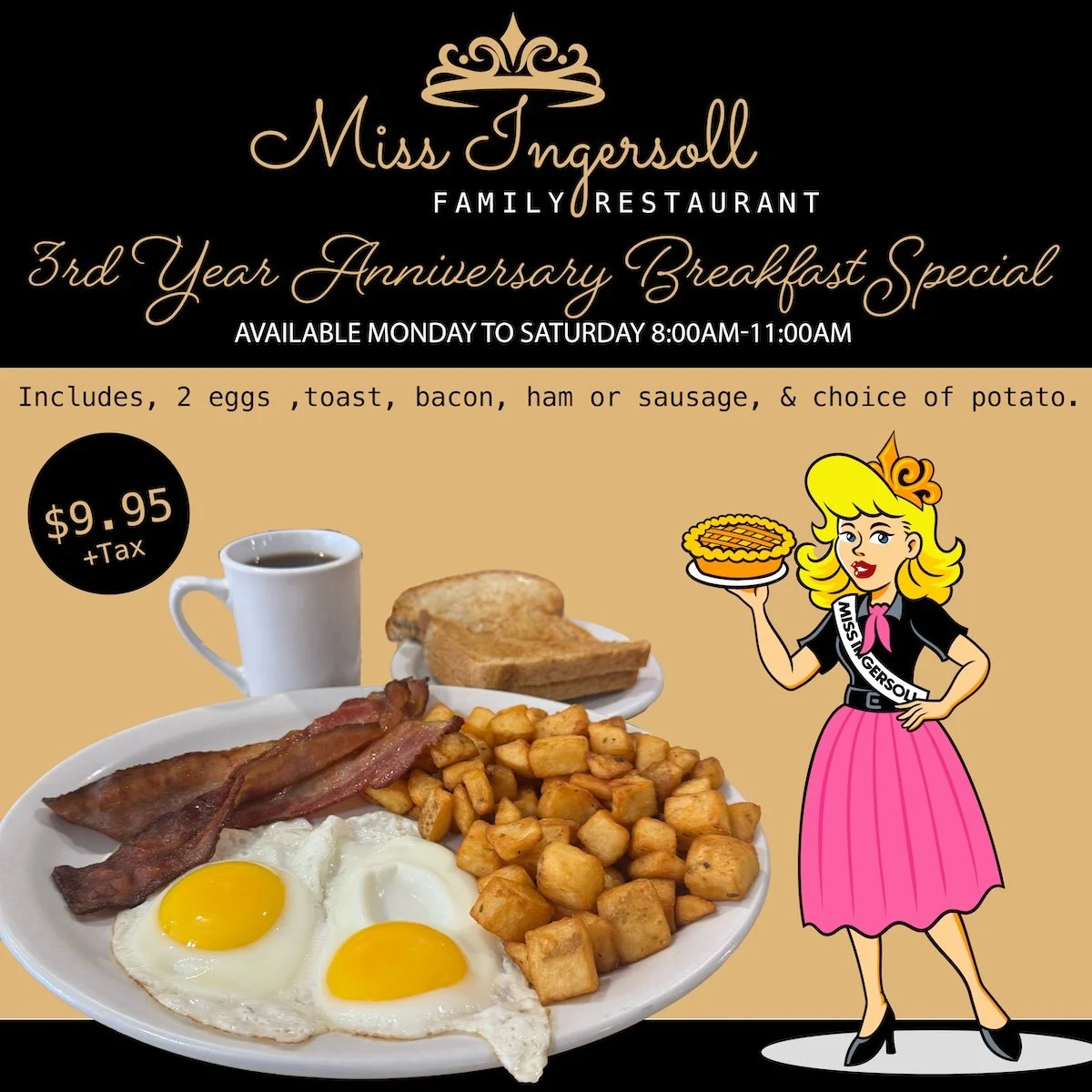 2 Eggs cooked to order Choice of Bacon, Ham or Sausage Choice of Potatoes Toast, Coffee, Tea or Small Juice